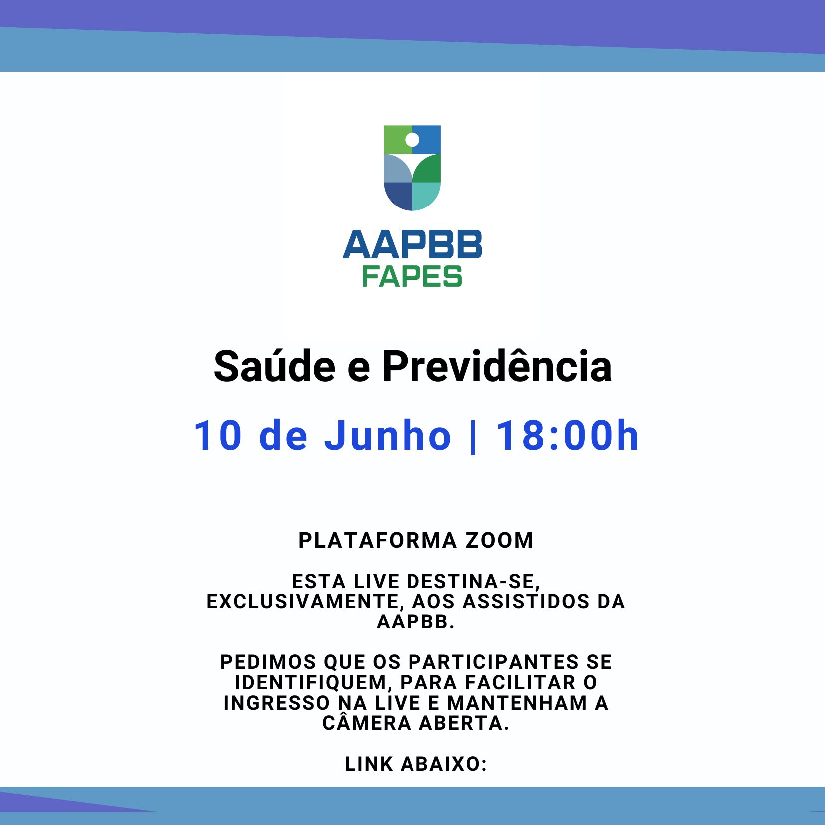 Live dia 10/06 às 18 horas. Saúde e Previdência O link com as informações de acesso a reunião será enviado para o e-mail do associado. Ler mais 6 de Junho, 20256 de Junho, 2025Por AAPBB-FAPES