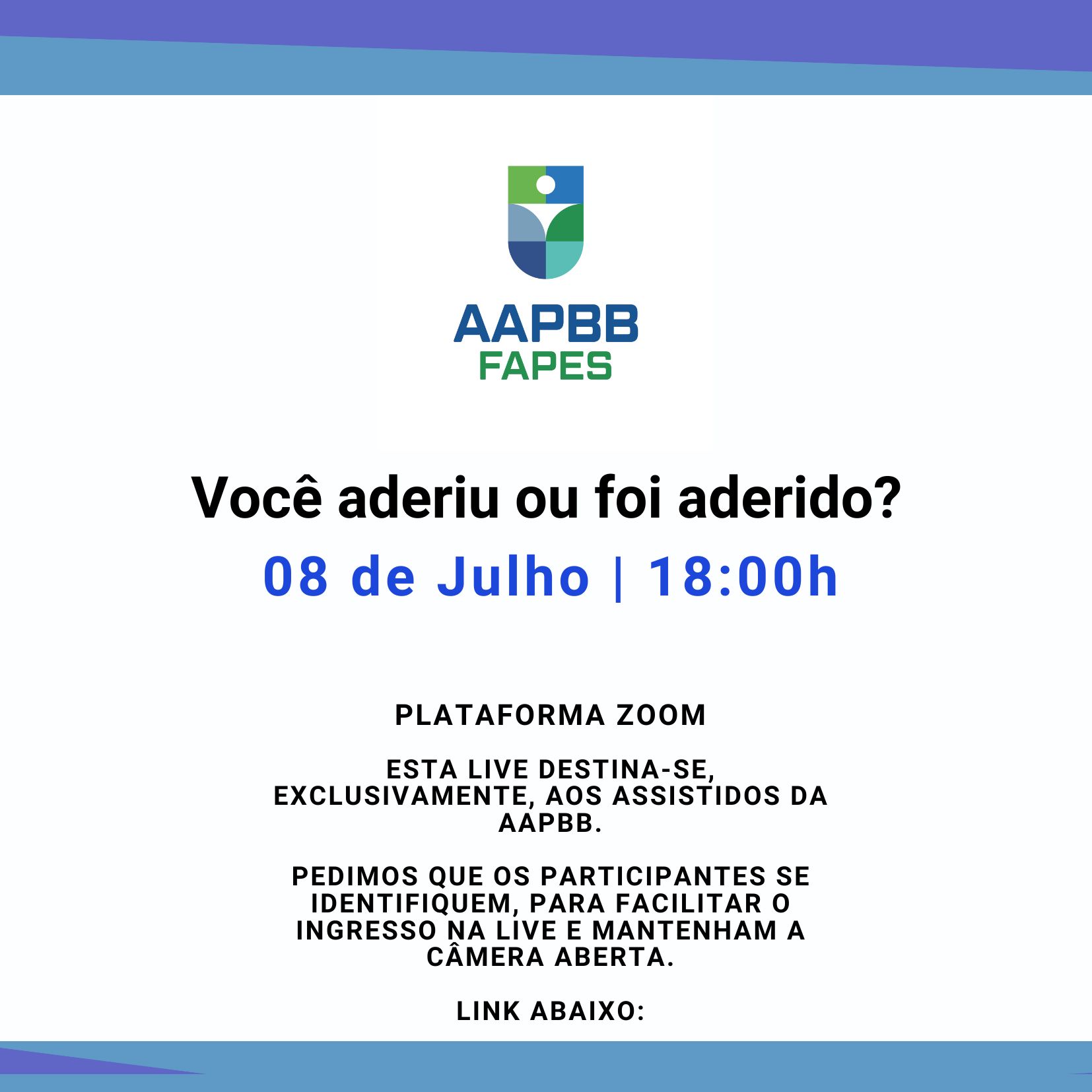Live dia 08/07 às 18 horas. Você aderiu ou foi aderido? O link com as informações de acesso a reunião será enviado para o e-mail do associado. Ler mais 7 de Julho, 20257 de Julho, 2025Por AAPBB-FAPES